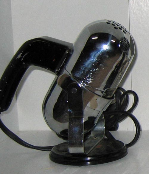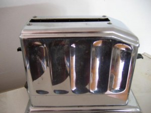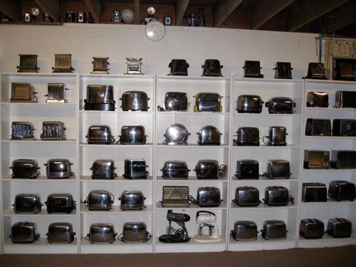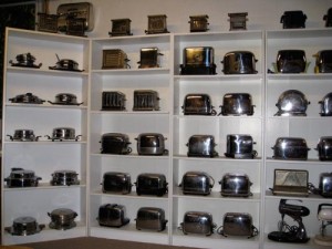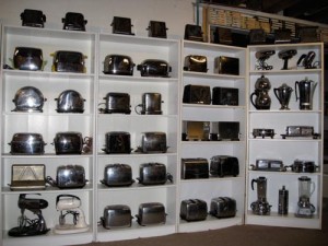For the past several years I’ve collected toasters and other housewares. I especially like the shiny, chromy, art decoish ones from the 1930s-50s. Here’s a picture of my toaster collection, along with some waffle irons, blenders, mixmasters, percolators, cocktail shakers, seltzer bottles, and hair dryers that I’ve picked up along the way.